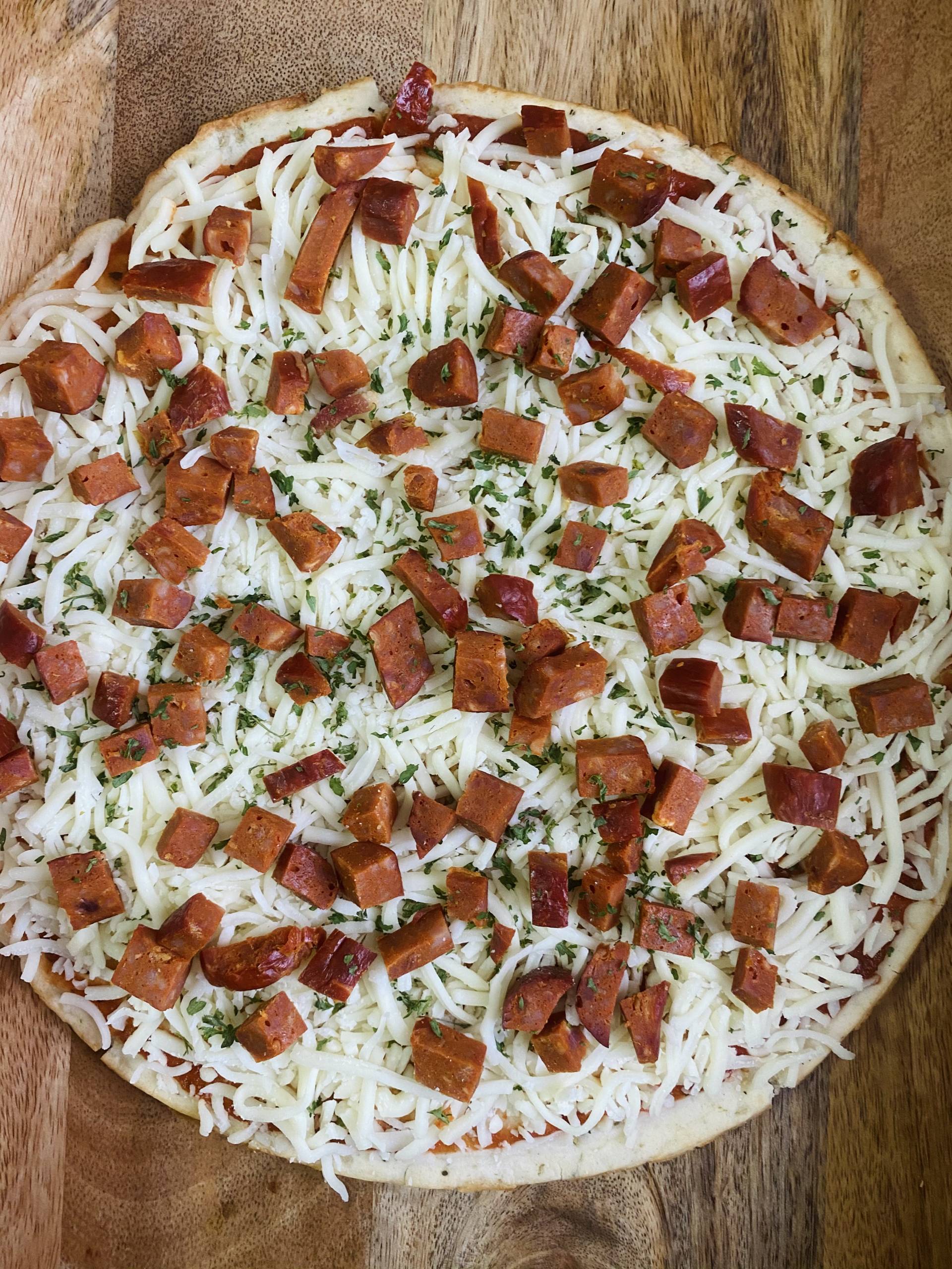 Pizza masa de coliflor 10”. Salsa roja, queso mozarella, chorizo.