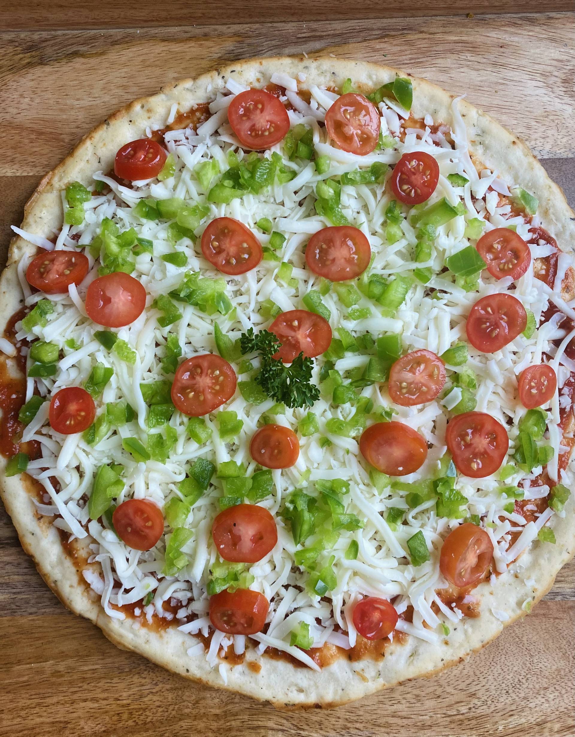 Pizza en masa de coliflor 10". Salsa roja, queso mozarella, pimientos verdes y tomates.